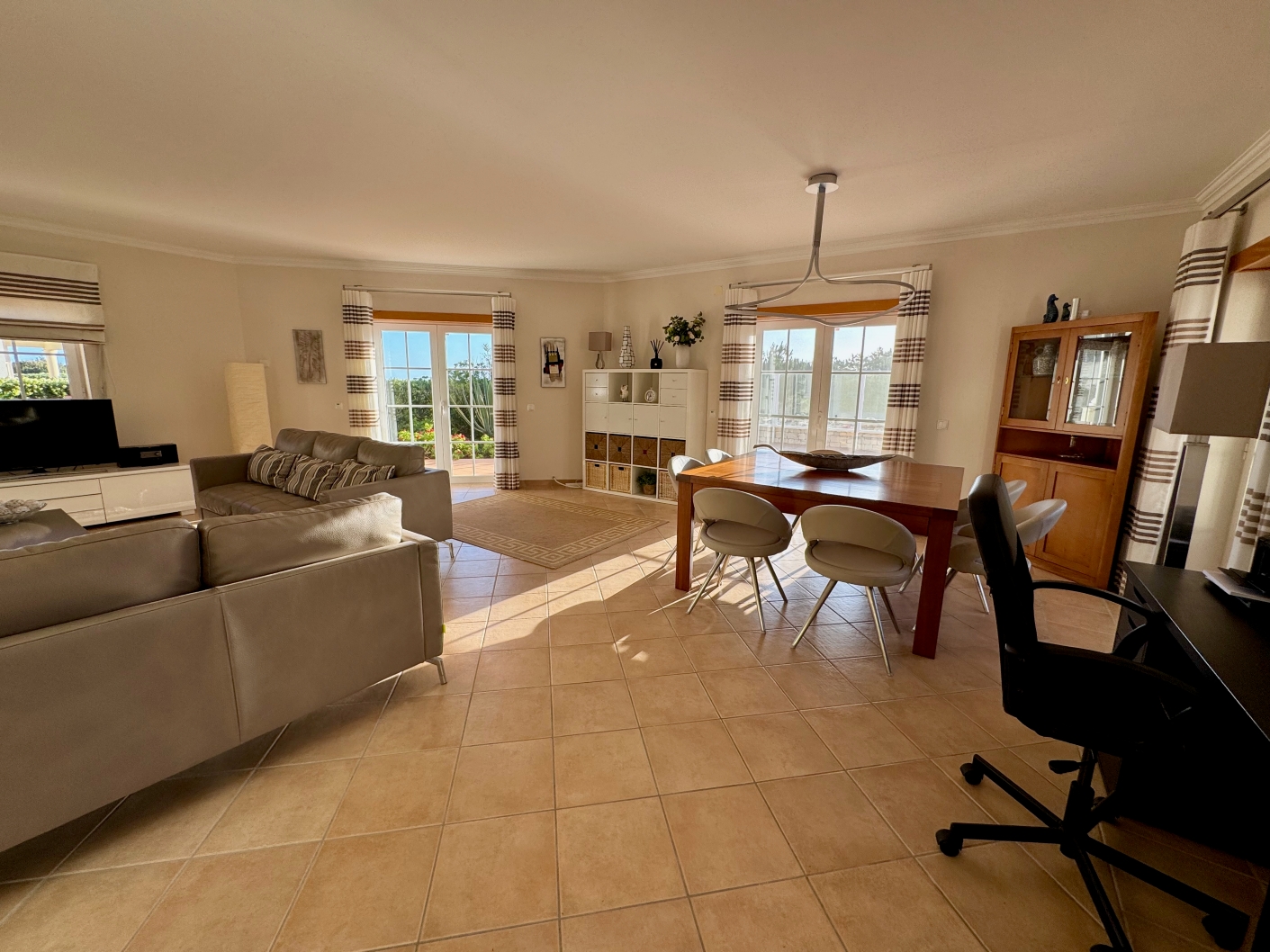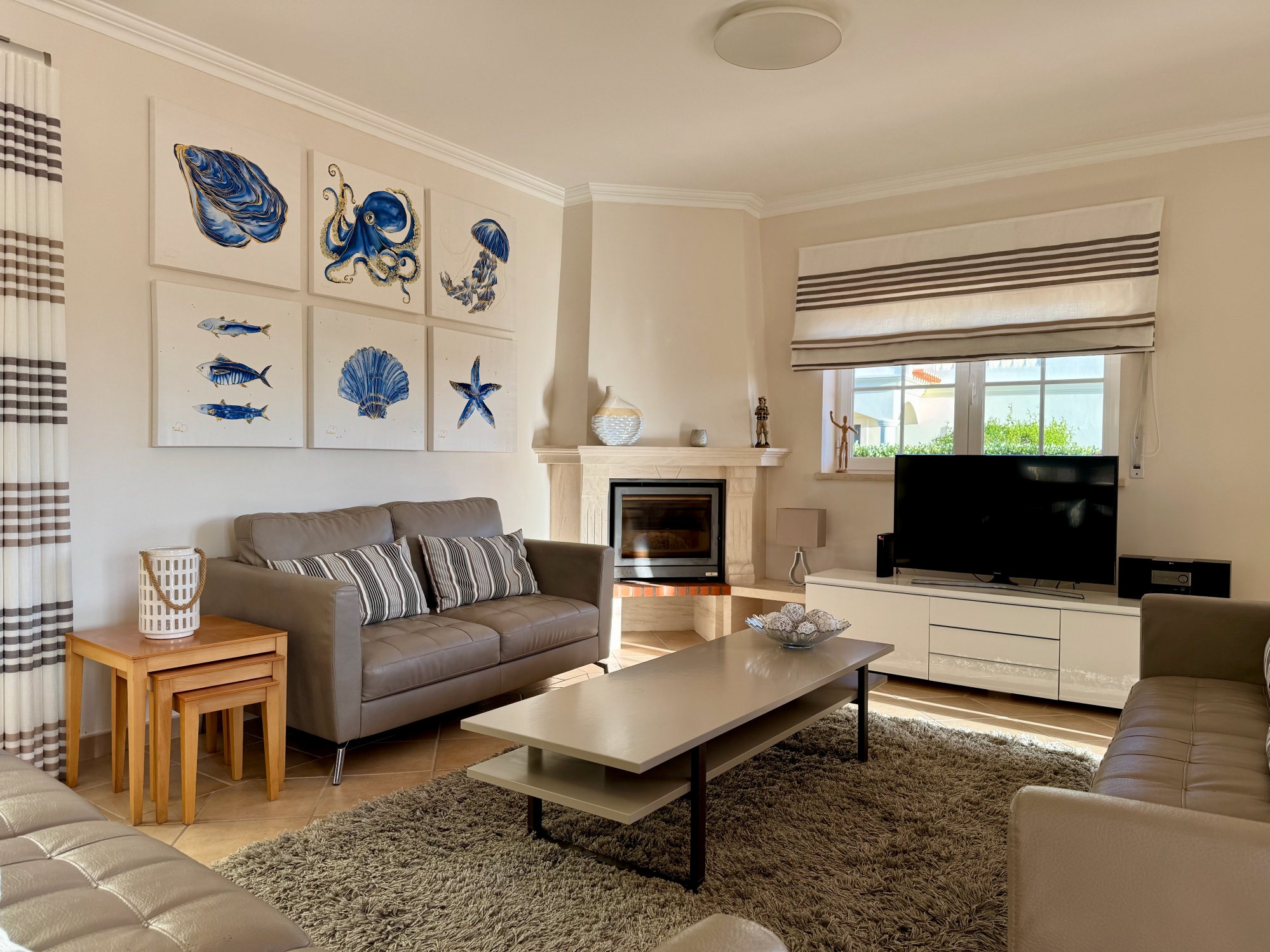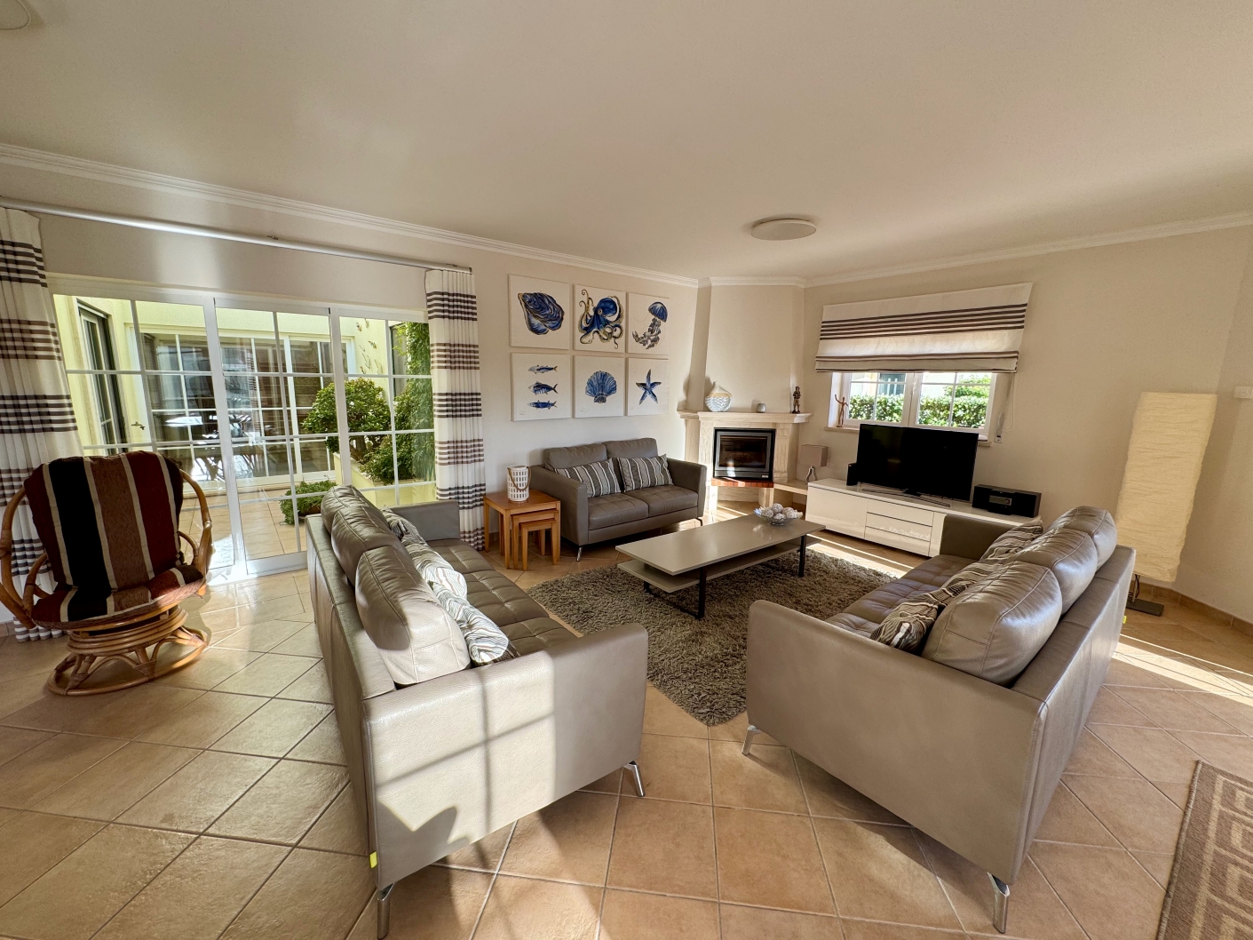 The villa is fully equipped and furnished to accommodate up to 8 guests, and is also used by the owners as a holiday home. The combined living and dining area, measuring approximately 7 by 7 metres, features 4 French windows opening onto the terrace and private pool on three sides. One sliding door leads to a unique 'internal' garden, offering excellent (and secure) ventilation. The seating area comfortably accommodates 8 people, ideal for gathering around the fireplace and TV. Both the living room and dining room lights are dimmable, creating a relaxed atmosphere.